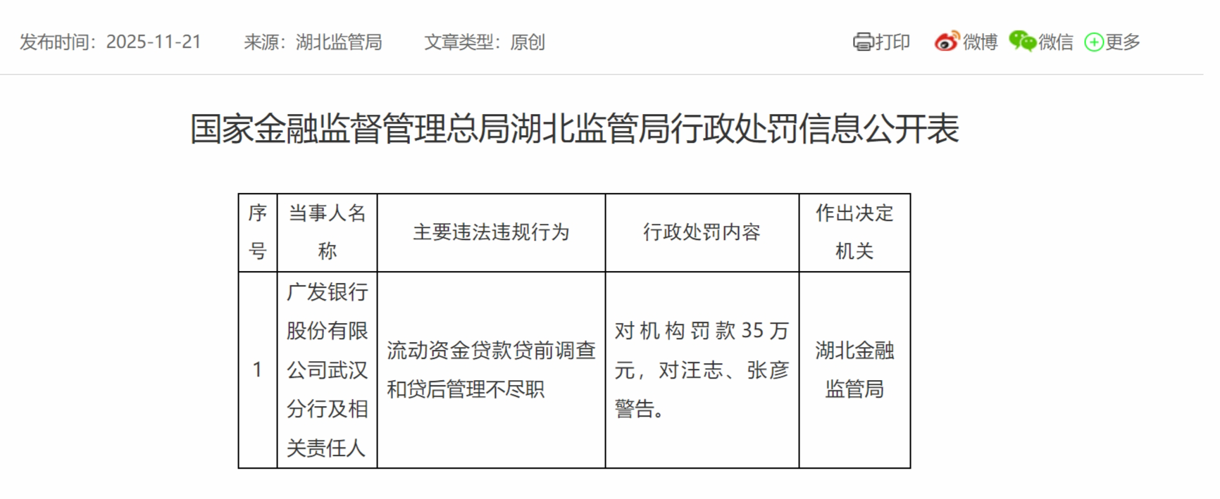 全民配资APP下载 流动资金贷款贷前调查和贷后管理不尽职,广发银行武汉分行被罚款35万元 全民配资APP下载 来源:富余通配资平台 网站:天宇优配 日期:2026-04-01 19:29:20 查看:198